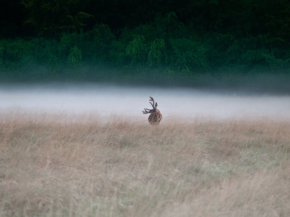 A seam of fog divides forest from open. He turns once—between staying and going—and carries the pause with him