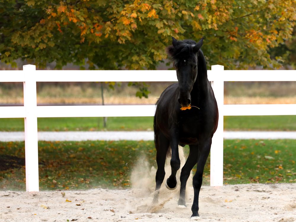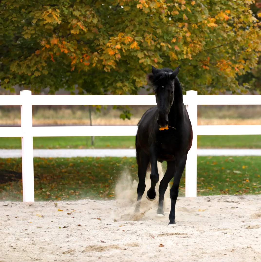 This photo was taken Halloween 2025. Desejo, being black, fit the theme perfectly. The white fence is a beautiful contrast to the black color. He picked up a leaf, the fall leaves on the trees were in the background and this shot was born!