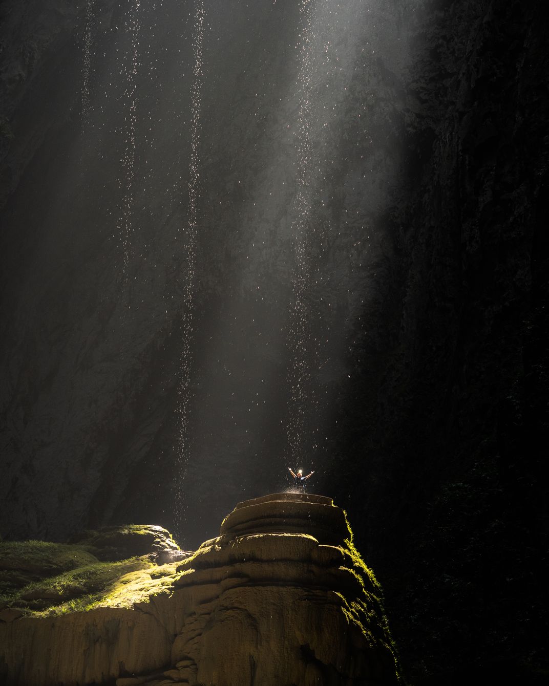 A tourist takes a photo while the sun shines deep into Son Doong cave through the first sinkhole (doline). Hang Son Doong, the world's largest cave, is located in Quang Binh Province, Vietnam. It was discovered in 1990 and was put into operation in the form of adventure tourism in 2013. Each year a maximum of 1,000 people can visit the cave, with 10 people on each trip. The journey to explore this cave takes four days and three nights. In addition to physical preparation, visitors need to plan to completely lose contact with the outside world because there is no phone signal or internet.