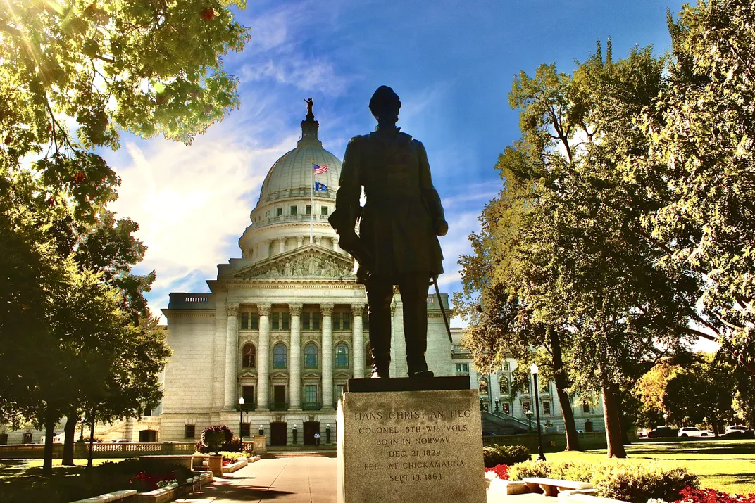 A statue of abolitionist and Civil War soldier Hans Christian Heg stands outside the Wisconsin State Capitol in Madison, Wisconsin.