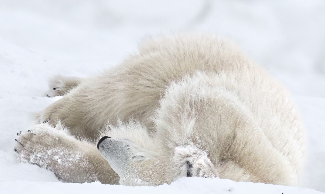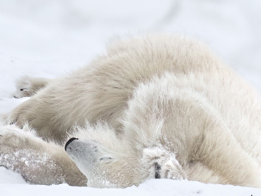 The ice and snow finally came to Churchill and this mother polar bear was happy to roll and sleep in the snow. Soon she and the cubs would be heading out on the adventure of survival and much needed food.