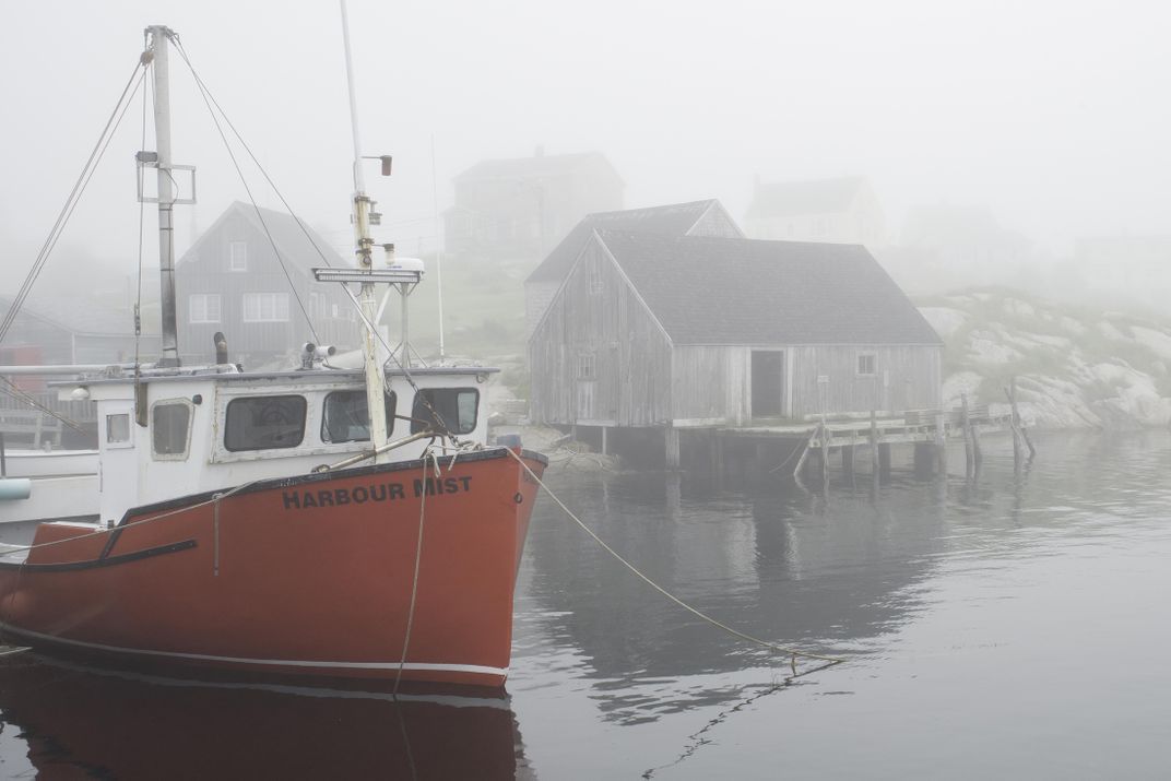 Fishing boat during a foggy morning at Peggy's Cove in Nova Scotia.