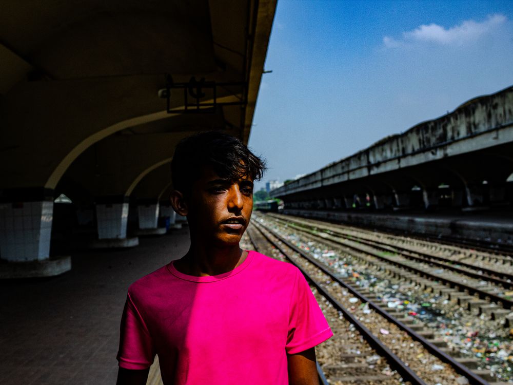 This photograph captures a young man, a porter, standing by railway tracks in Dhaka Komlapur railway station, Bangladesh. His expression conveys a deep sense of concern, highlighting the hardships he faces in his daily life, which often involves backbreaking labor instead of education. The image powerfully contrasts the demanding nature of his work with the lost opportunity for schooling, offering a poignant glimpse into the challenges many young people experience.