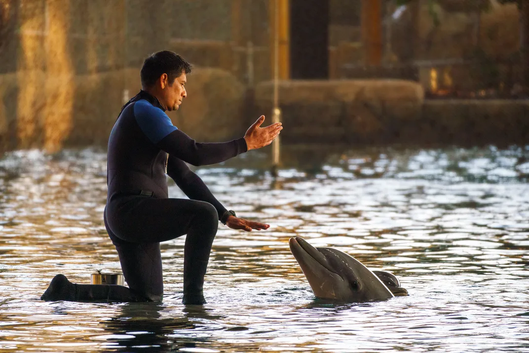 A fleeting moment of trust and connection — the dolphin rises from the blue, meeting the trainer’s outstretched hand in perfect synchronization. Captured within the vast, softly illuminated space of SeaWorld Abu Dhabi, the image reflects more than a performance; it reveals a shared language between species built on rhythm, respect, and play. The glistening water mirrors their movement, turning the scene into a quiet dance between human and ocean life.