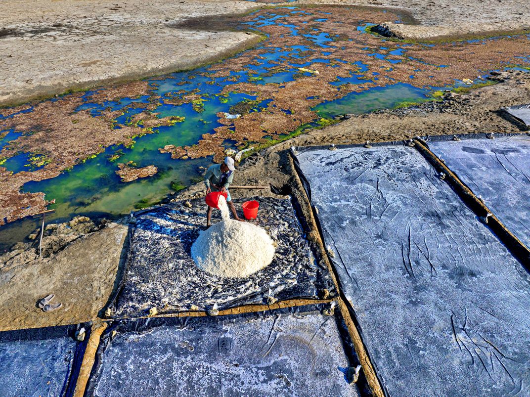 A salt worker gathers freshly crystallized salt into a white mound beside patterned pans and streaks of green water, turning a harsh coastal landscape into a patchwork of labor, light, and quiet perseverance.