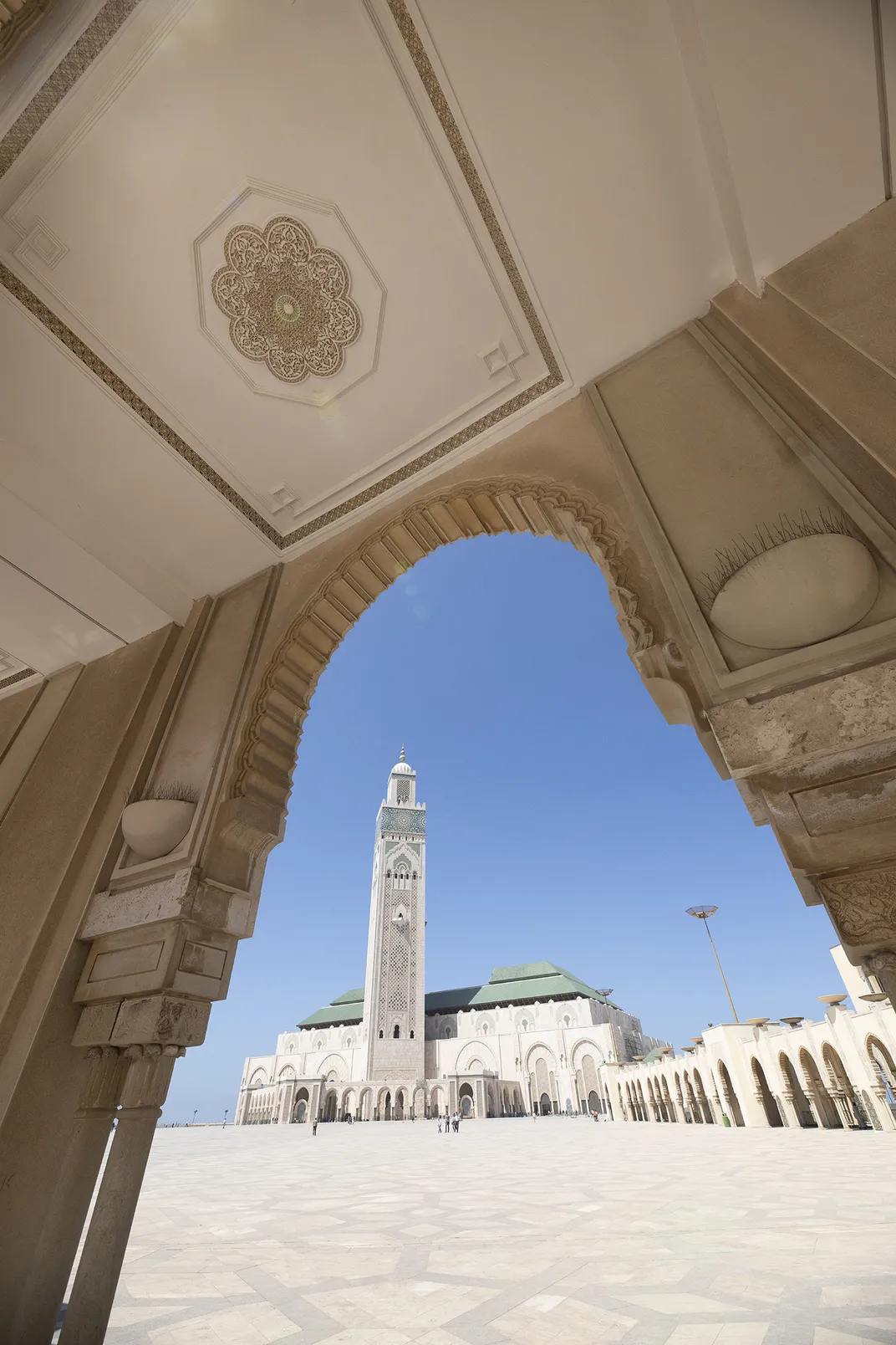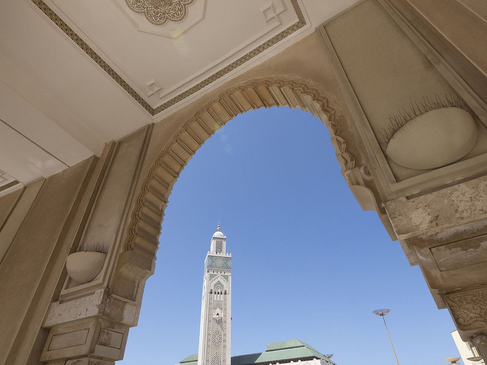 The Hassan II Mosque is in Casablanca, Morocco. It is the largest mosque in Africa, and the 5th largest in the world. Its minaret is the world's tallest minaret at 210 metres (689 ft). Completed in 1993, it was designed by Michel Pinseau and built by Bouygues. The minaret is 60 stories high topped by a laser, the light from which is directed towards Mecca. The mosque stands on a promontory looking out to the Atlantic Ocean; worshippers can pray over the sea but there is no glass floor looking into the sea. The walls are of hand-crafted marble and the roof is retractable. A maximum of 105,000 worshippers can gather together for prayer: 25,000 inside the mosque hall and another 80,000 on the mosque's outside ground.