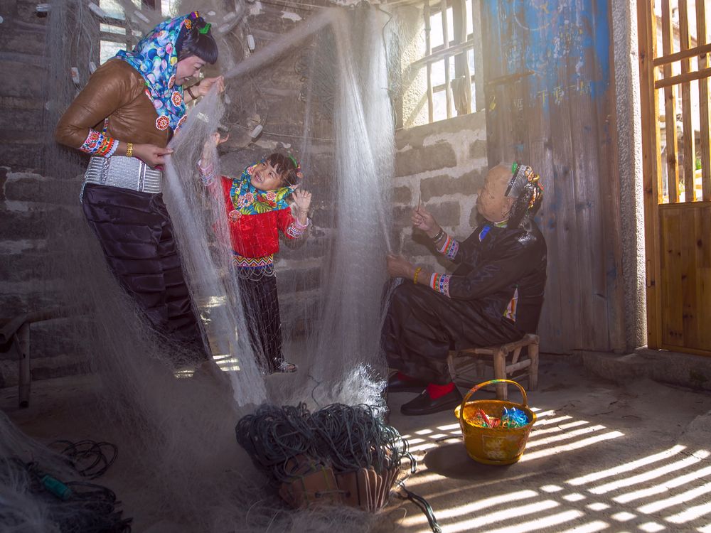 Three generations of grandparents and grandchildren amused their children at home in their spare time. The whole family was happy and laughing.