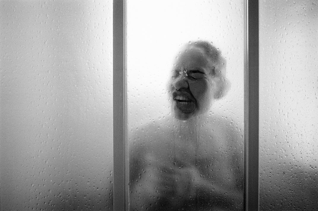 Maya (my girlfriend) was in the shower when she started acting silly to make me laugh from the other side of the shower screen. I couldn't resist taking this picture so we could laugh together.