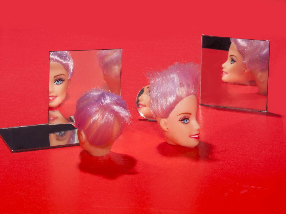 Detached doll heads with purple hair are arranged to face mirrors, reflecting fragmented faces, exploring identity and perception.