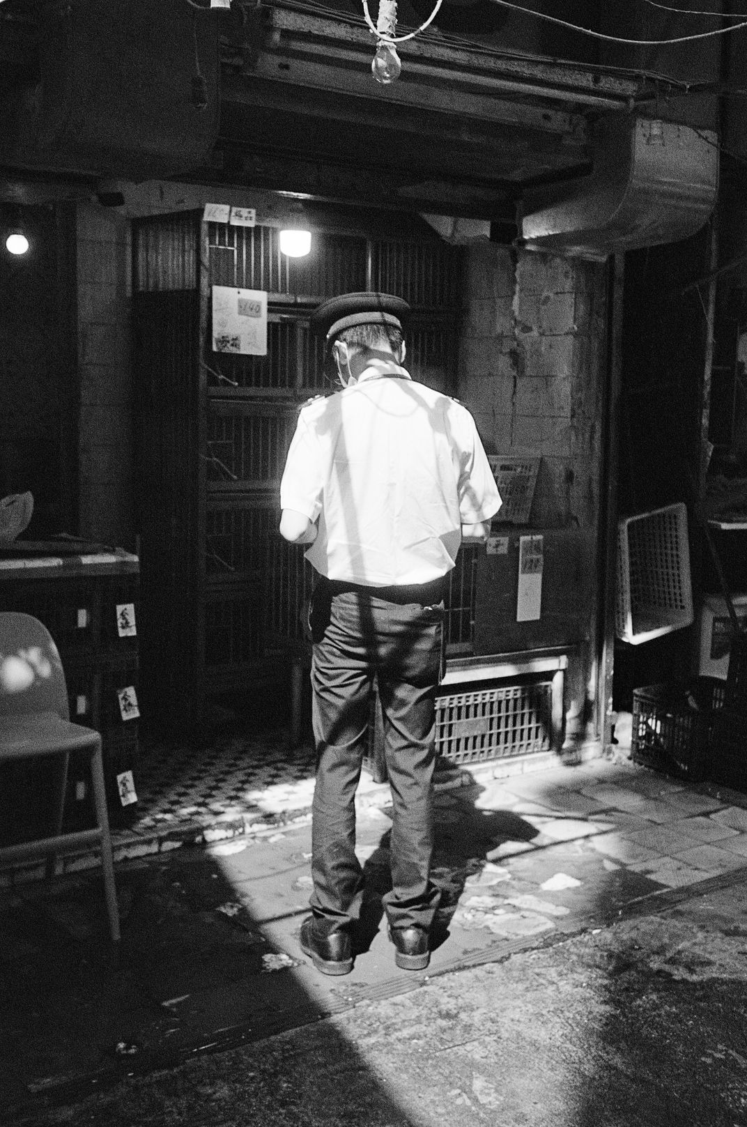 A member of the Hong Kong Public Health Office inspecting a butchers.