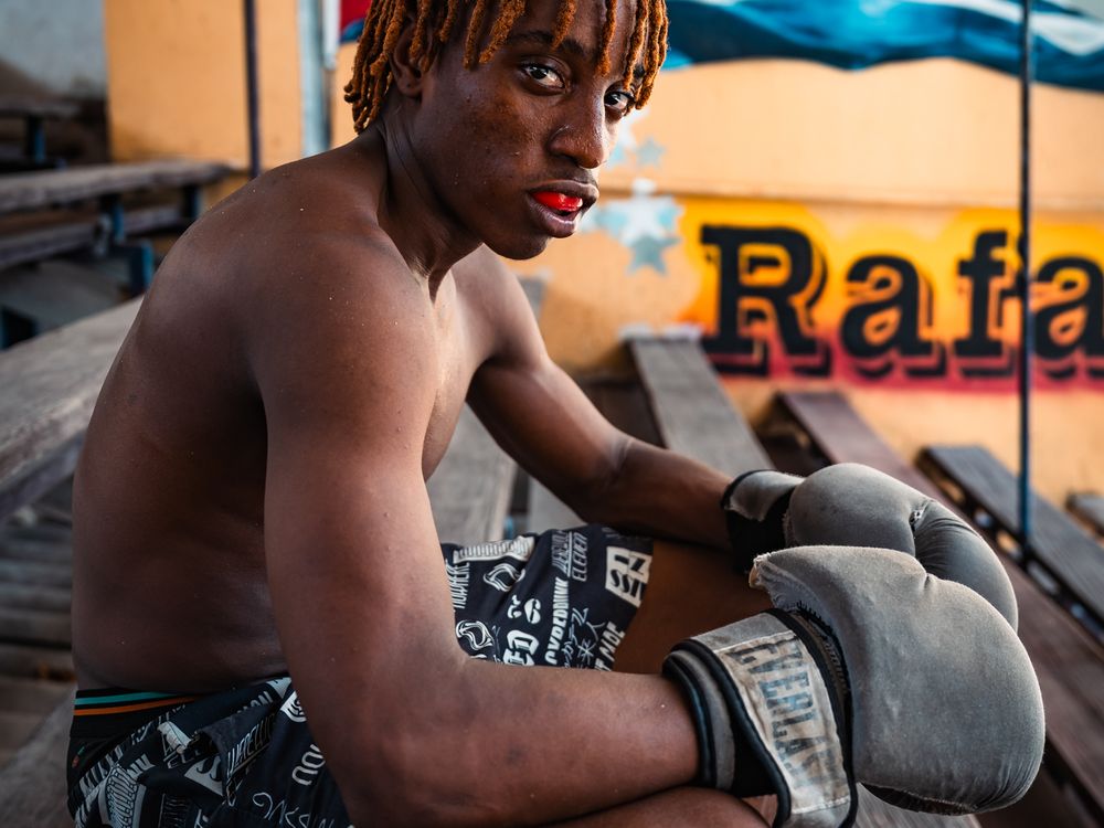 Hector (19) is a young boxer rests between rounds, his worn gloves on his knees and sweat still fresh on his skin. With the Cuban flag waving behind him, he sits with calm determination capturing the grit, pride, and quiet ambition that drive his training every day.