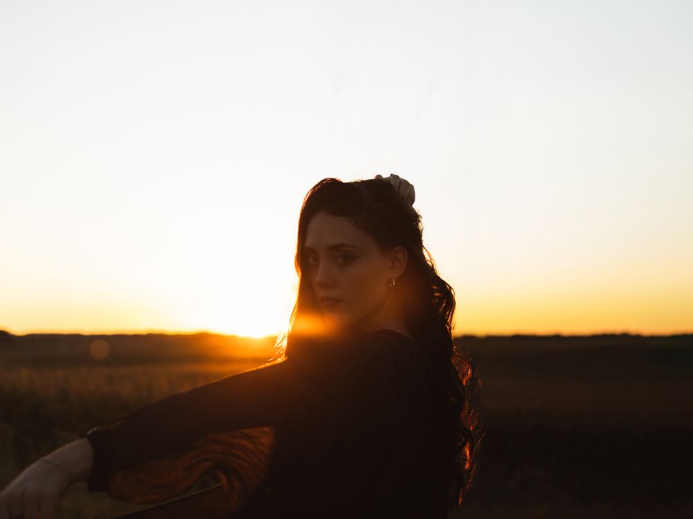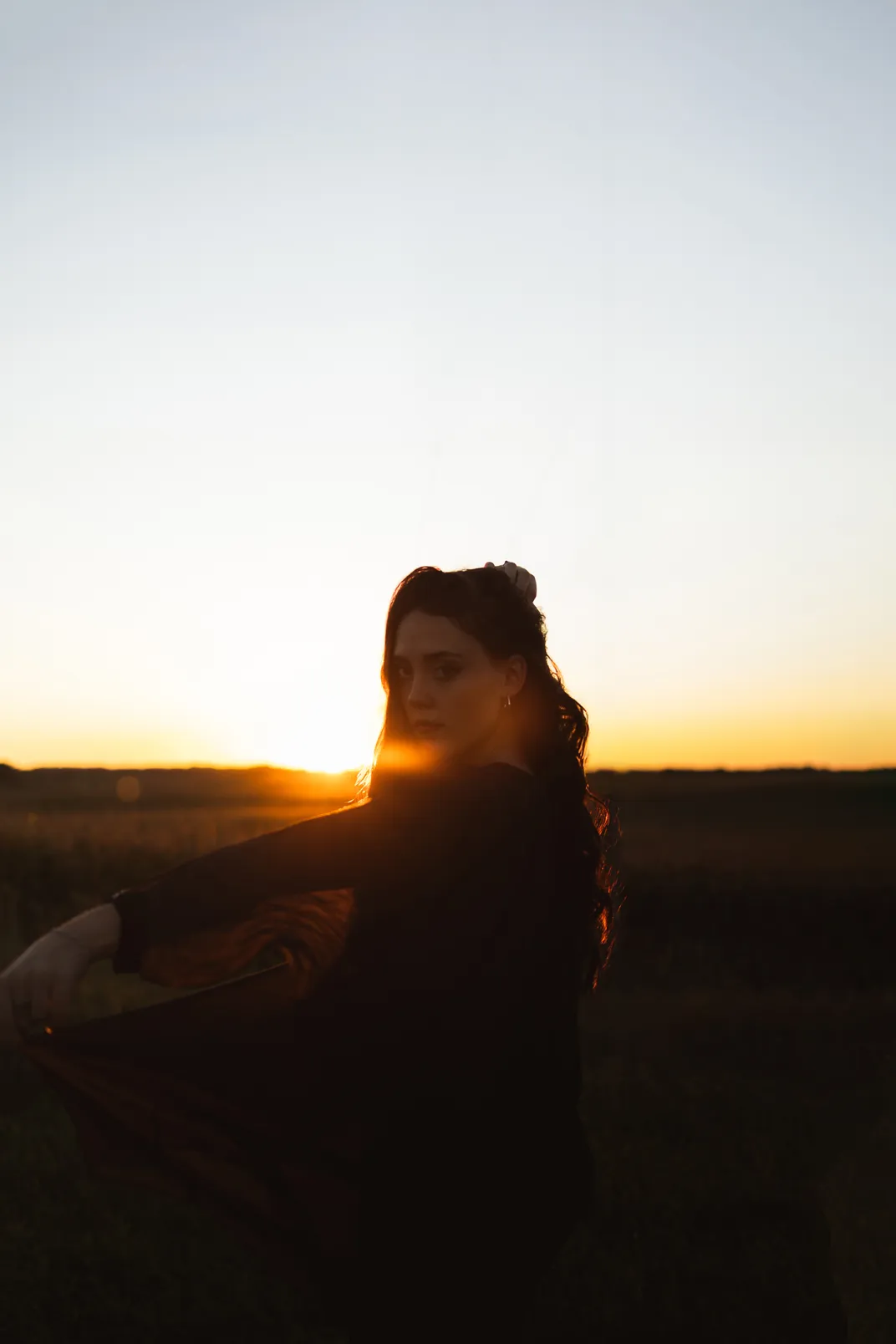 Portrait of model Anna Stilwell during a sunset in rural Minnesota