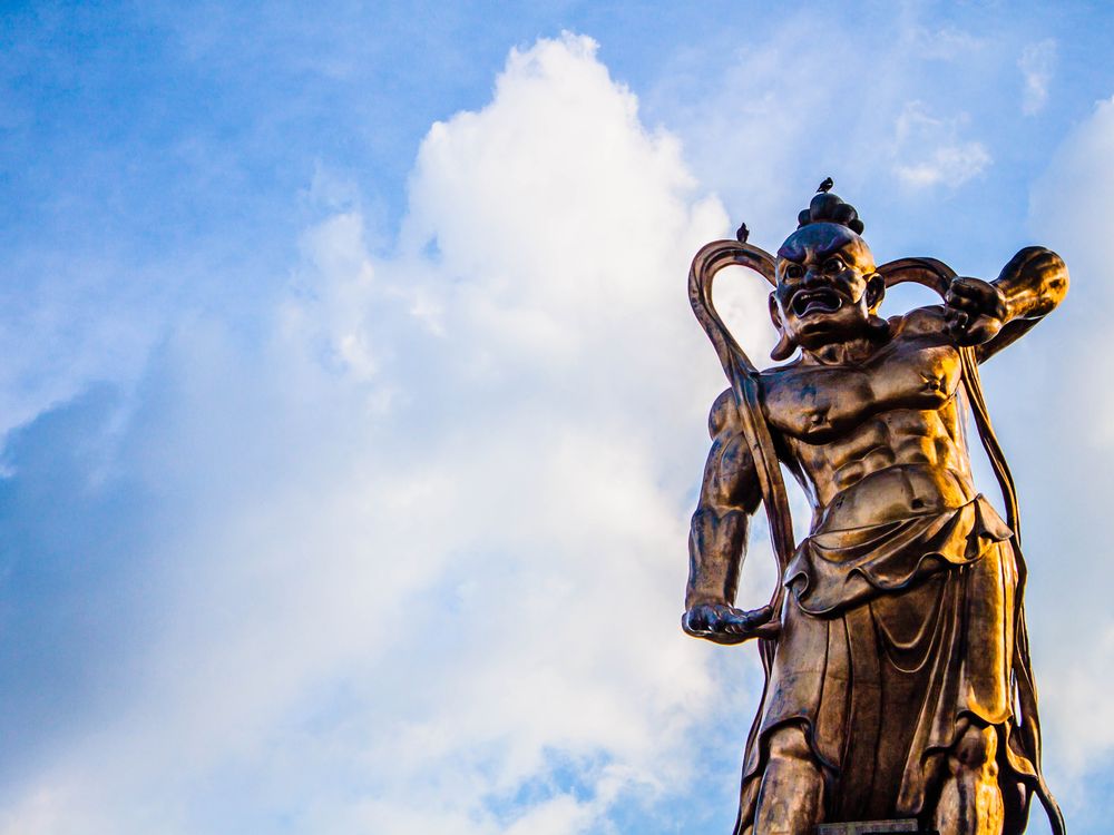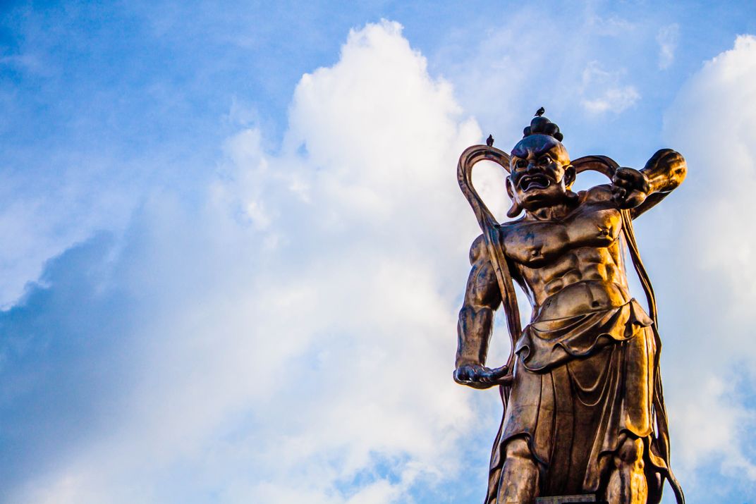 This is a statue of a guardian deity. It strives to show that it will protect the innocent, no matter how small or insignificant, even if they are just birds, perched on his head.