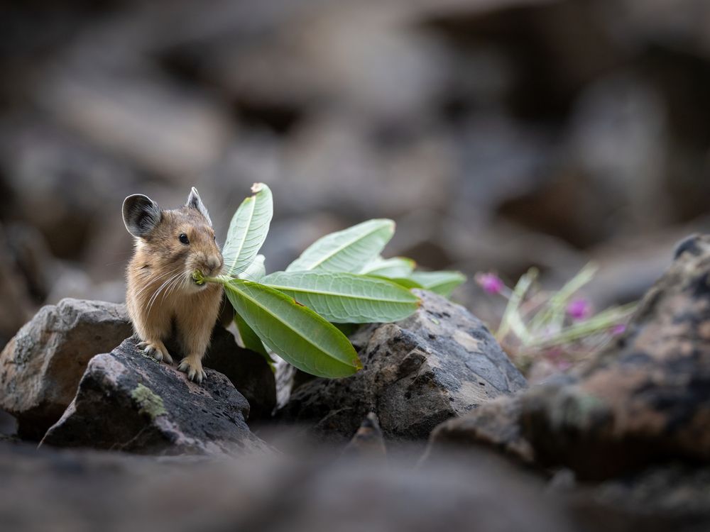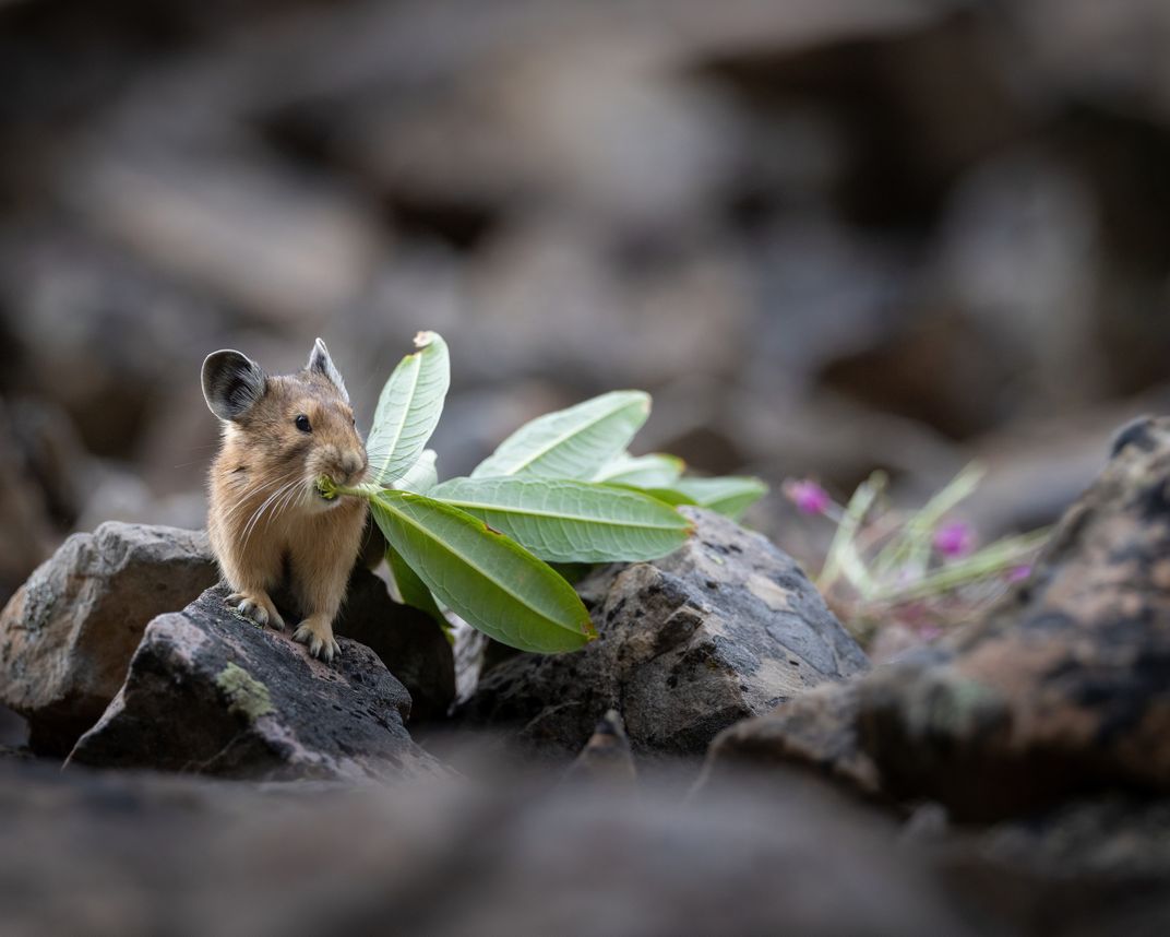 An American Pika drags a piece of fireweed more than 3x his length over a rocky talus field.