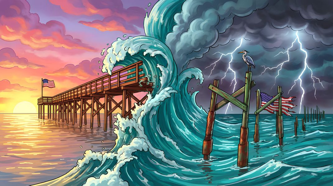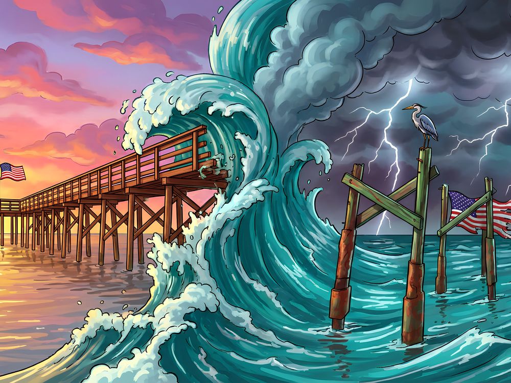 This entry is a vivid photographic composite, meticulously crafted from seven original photographs of the La Contessa Pier (pre- and post-Hurricane Helene) and an image of a favorite Blue Heron. The work presents a dramatic visual dichotomy: the left side captures the pier's pre-storm serenity under a tranquil sunset, while the right depicts its storm-battered pilings beneath a sky charged with lightning and ruin. A central, towering wave symbolizes the catastrophic force of Helene that severed these two realities. Anchoring the piece is the Blue Heron, poised amidst the wreckage, a potent symbol of resilience and the persistent, indifferent beauty of nature that remains after human structures fall. The American flags on either side further frame the narrative of a community's loss and endurance.
