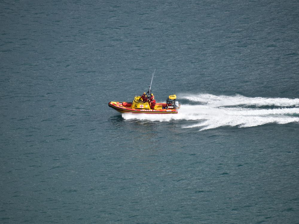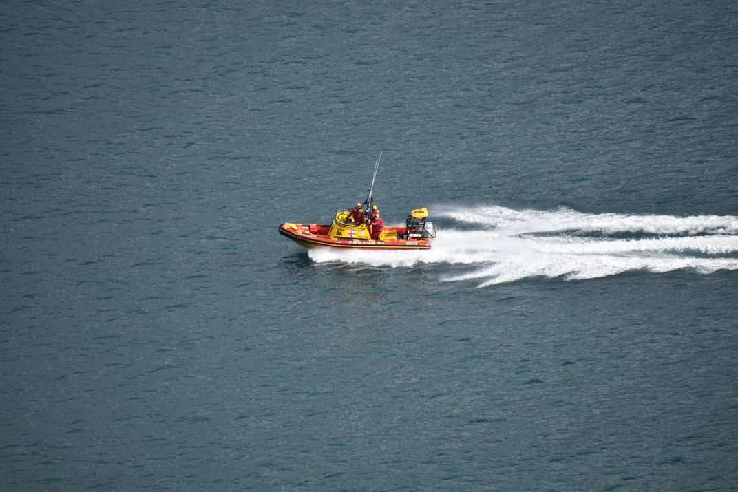 This photograph was taken from a birds-eye view on a mountain looking down at the Atlantic ocean in Cape Town, South Africa. In the picture, there is a rescue boat with rescuers in full wet suits rushing to need of somebody. The story is that there are always heroes in the world ready to put their lives at risk for others.