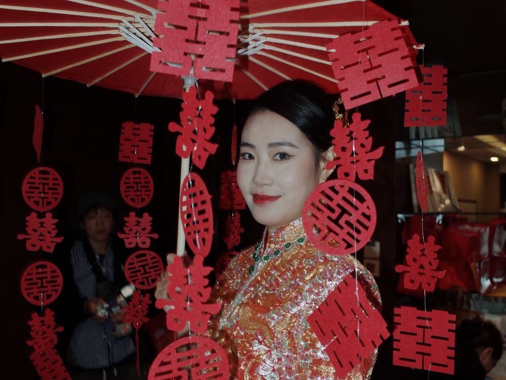In our culture, red is highly cherished in weddings, as it symbolizes joy and happiness. As you can see, she is also holding a red umbrella adorned with various calligraphic styles of the Chinese character "喜" (double happiness) along its edges. This further enriches the atmosphere, enveloping her in a blend of tradition and celebration.