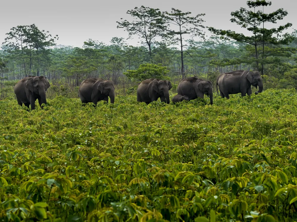 Herd of Elephants. A group of elephants that live and travel together is called a herd. Elephant herd is lead by the oldest female. Manas National Park in Assam, India is UNESCO World Heritage Site of Elephant Reserve. It is the Largest Wild Animal in the Asia Continent. The inhibit dry to wet Forest and Grassland habitat They use their trunks to pick up objects, trumpet warnings, greet other elephants, or suck up water for drinking or bathing, among other uses. Elephants need extensive land areas to survive and meet their ecological needs, which includes food, water, and space. On average, an elephant can feed up to 18 hours and consume hundreds of pounds of plant matter in a single day. Here Elephant are eating leaves and grass in a group including baby elephant.