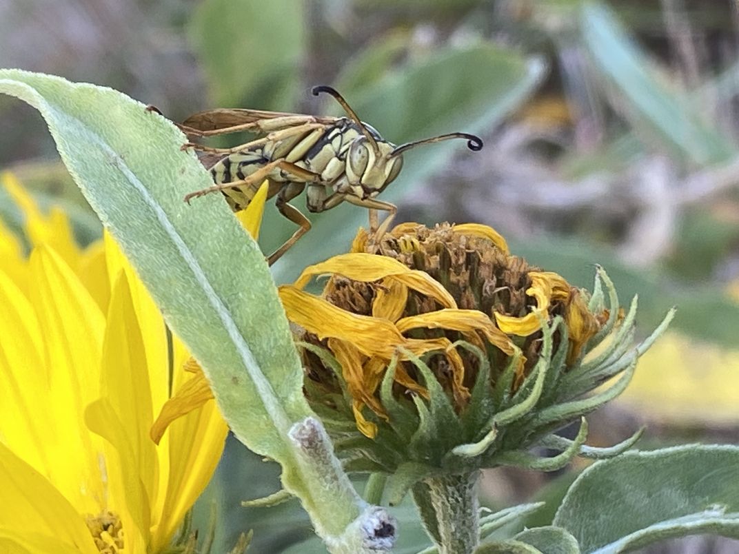 Photo of a wasp on a flower, appearing to look at the photographer.
