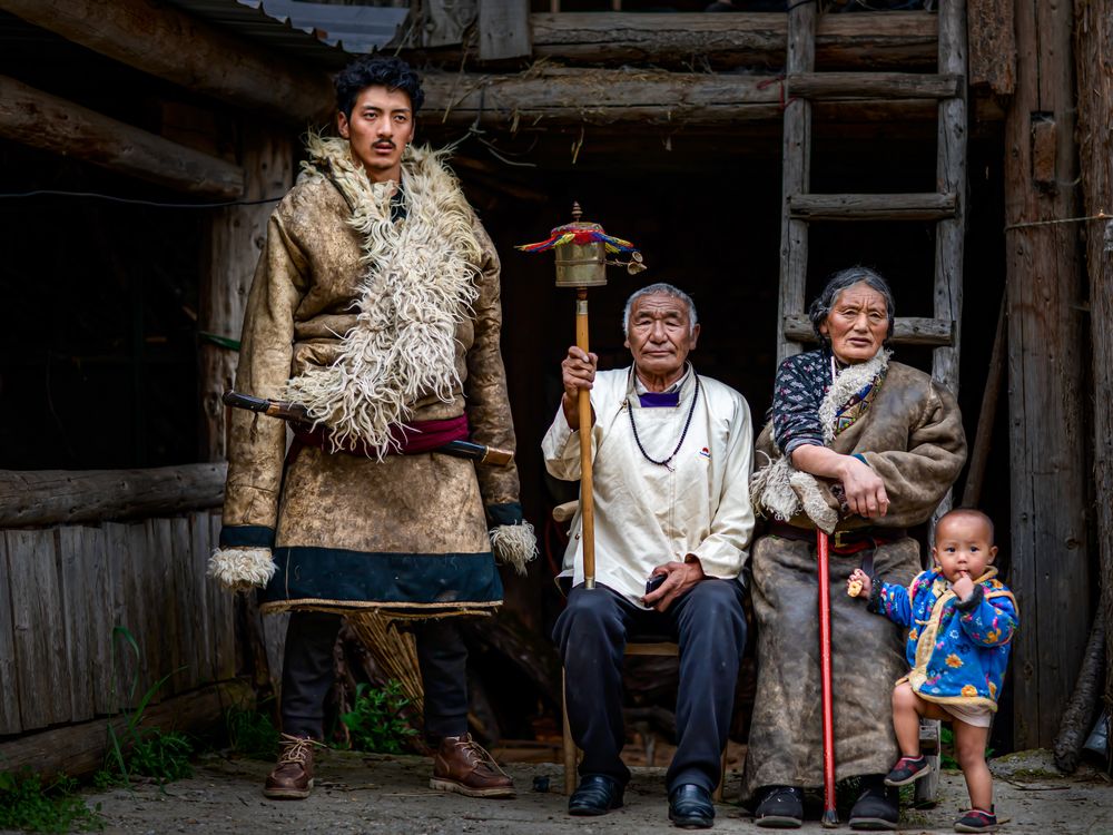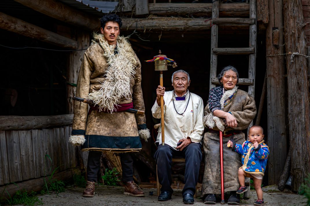 An elder holds a prayer wheel, passing on steadfast devotion to faith; the innocent faces of children create a striking contrast with the weathered expressions of their elders.