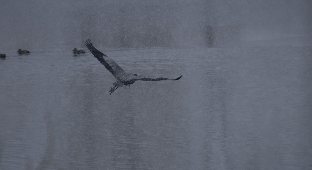 This was my first outing with my camera: in the middle of a snow storm down by Eaglewatch Lake near the South Platte River in Colorado. The heron rose out of the snow and I clicked . . .