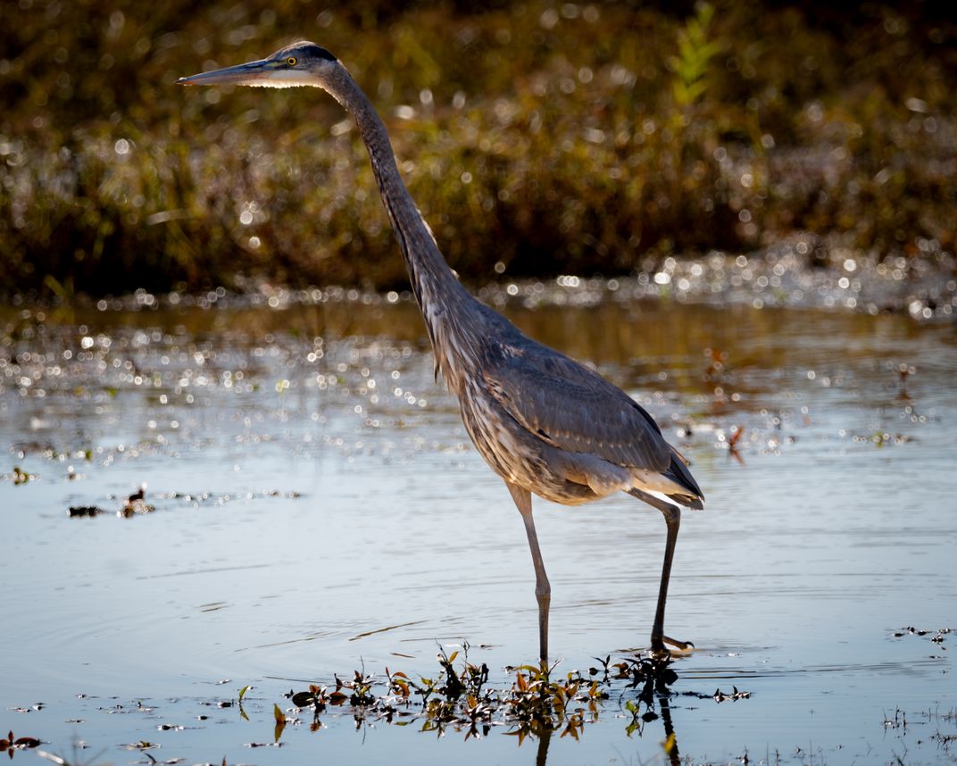 Heron standing in the water in the marsh land at Huntley Meadow Park