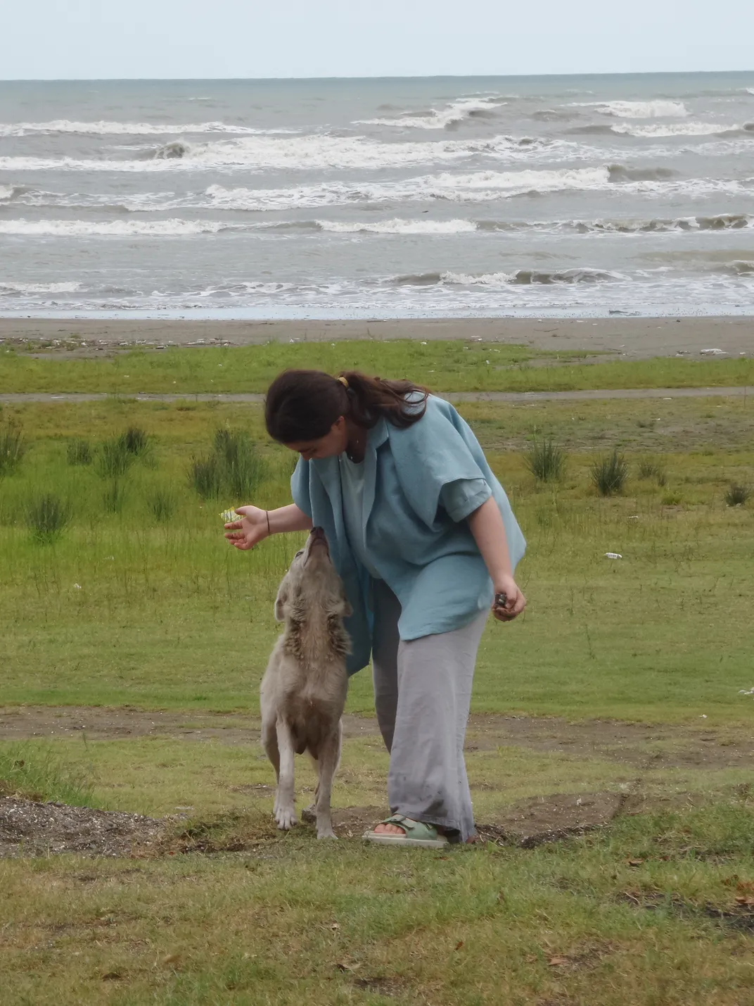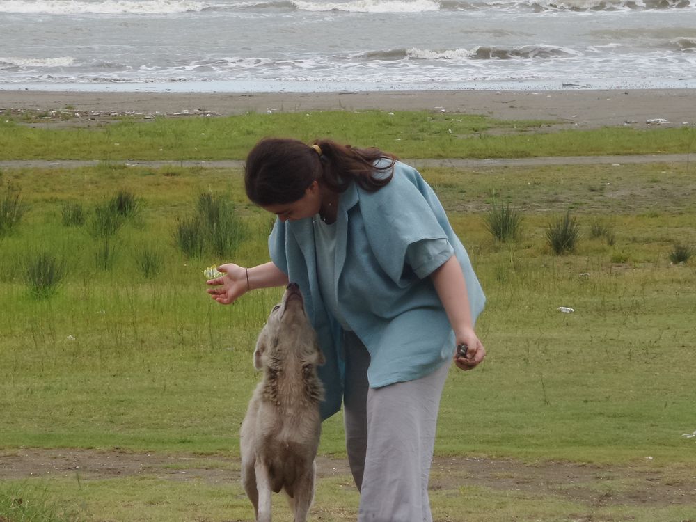 A girl taking a walk at the beach, sees a quiet dog lying in a corner, she calls to the dog as a friendly salute, and the dog befriends her in the blink of an eye!