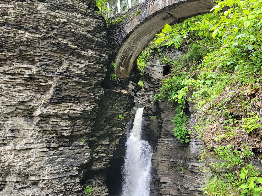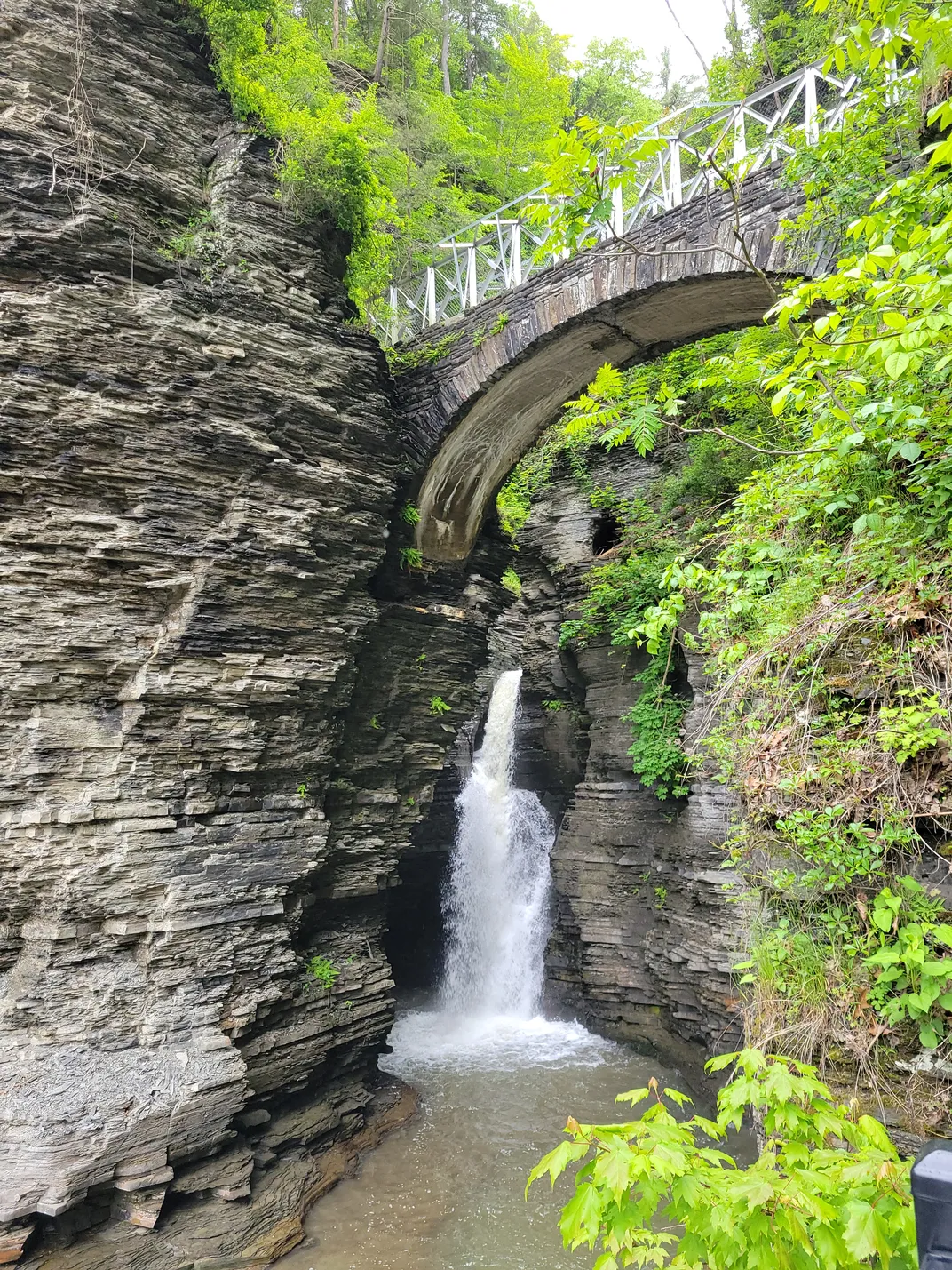 As you step into Watkins Glen, the gorge reveals its first secret—a waterfall flowing under the entry bridge, framed by towering stone walls.