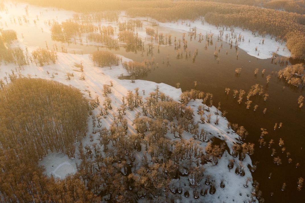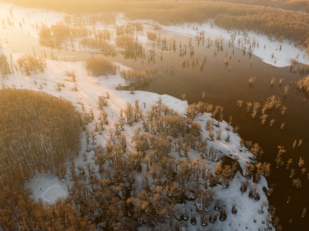 During the Texas freeze of 2021 I traveled out to east Texas to photograph one of Texas's iconic lakes. This is an overhead photograph of Caddo Lake during that freeze and a river of free moving water that had cut through the ice to flow perpendicularly to a vein of Cypress trees.