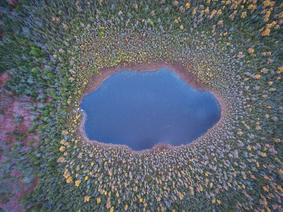 As I flew my drone over the Door County Peninsula, I discovered a small hidden lake against fall foliage.