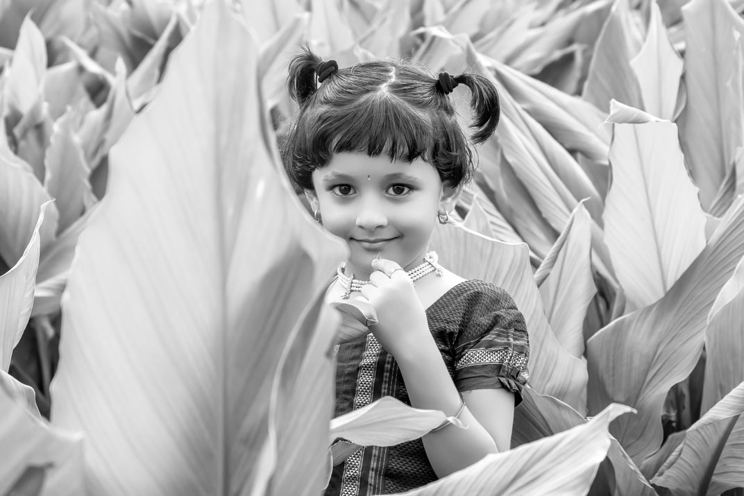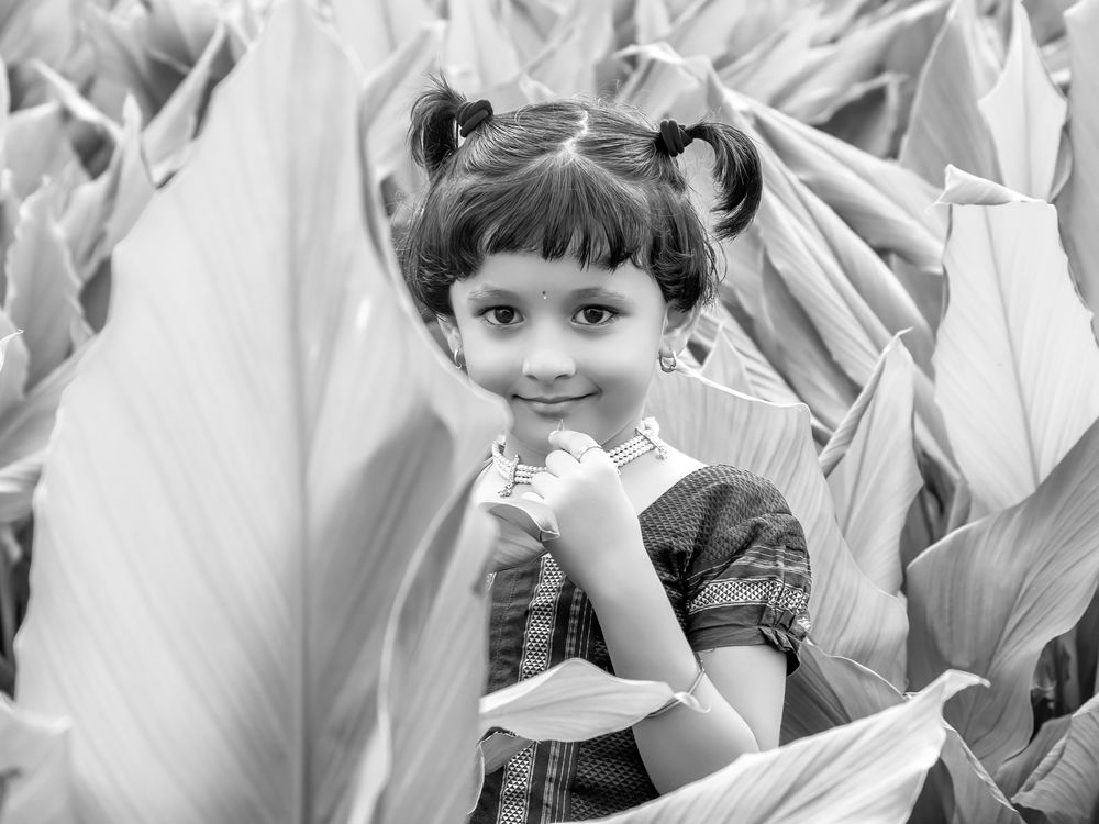 A captivating moment of a young girl, dressed in traditional attire and adorned with jewelry, peeking out from a dense grove of large, lush leaves. Her expressive eyes and shy smile create a charming contrast with the dramatic, natural backdrop. This photograph beautifully captures the innocence and traditional grace of childhood set against nature's grandeur.