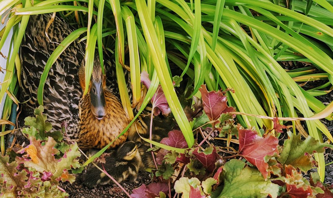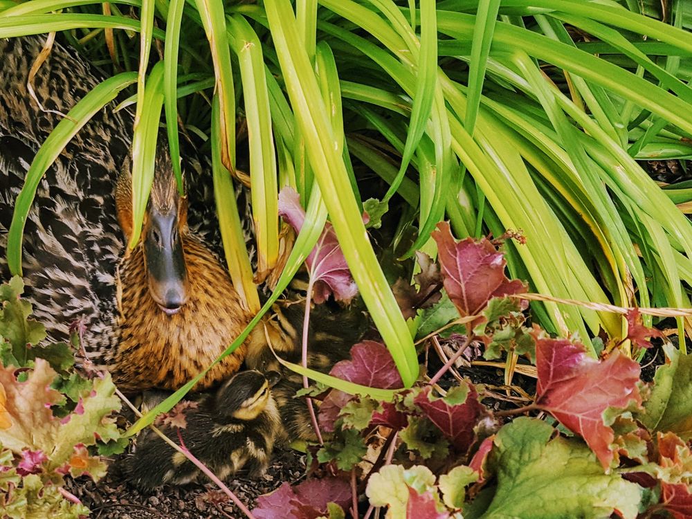Just a beautiful representation of mother nature at work. A mother's job is never done. I believe there were actually 10 chicks by the time she left for her long walk to the creek. Year after year I have a pair of mallards swim in the cover of my pool. It is a beautiful sight to see how attentive they are to each other. Brings me joy when they arrive.