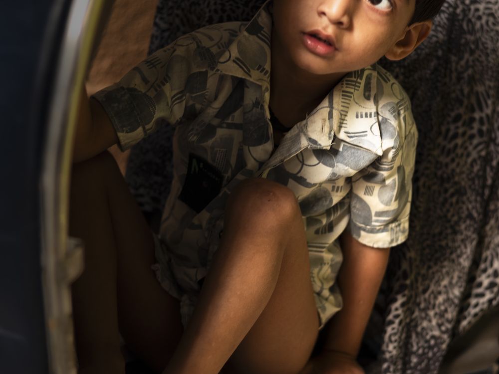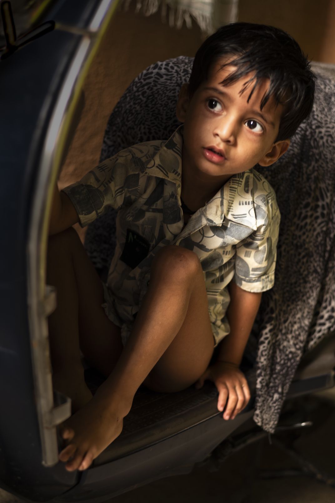 Hiding in the footwell of a scooter during a game with neighbors, this boy can't resist taking a peek to see if the pursuers are near