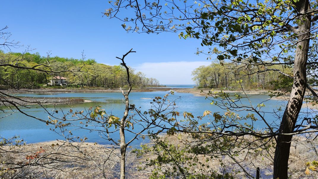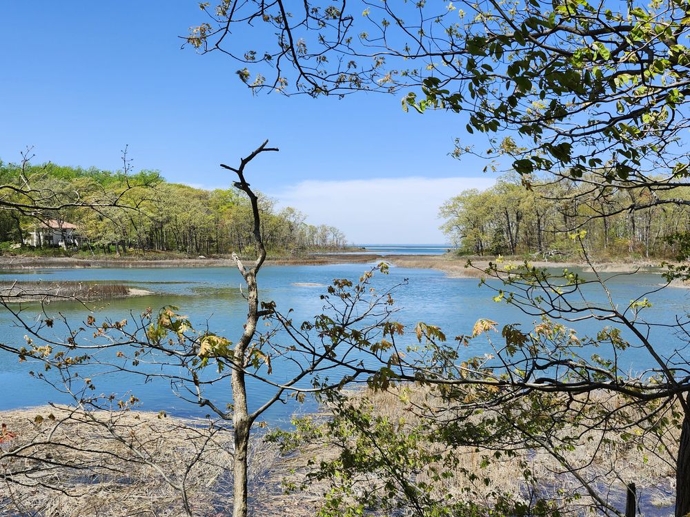 This picture is a view looking west at the marsh in Caumsett State Park. It was taken standing on the embankment on the side of Fishermans Drive. The house is on land which is not part of the park. The group of trees in the background on the right is Fly Island. The very thin horizontal white line in the middle is the sand bar. The high tide seen in the picture is higher than usual due to the tidal cycle.