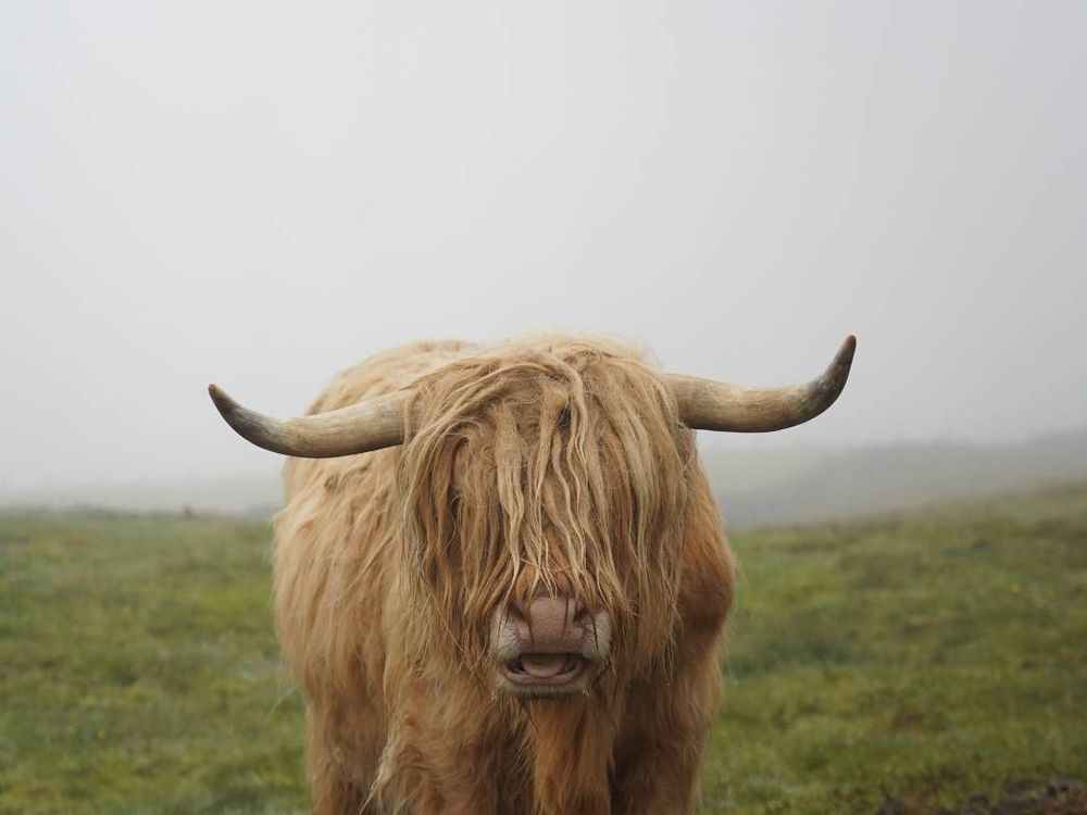 A Highland cow stands quietly in a fog-covered pasture of rural Norway. Its long, golden hair drips with morning mist, embodying calm resilience in a landscape where silence feels infinite.