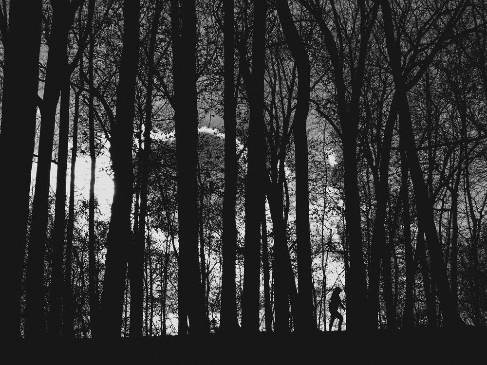 An unknown hiker moves through the tree line of a trail in Rock Creek Park. The sun shining behind them renders them only a silhouette.