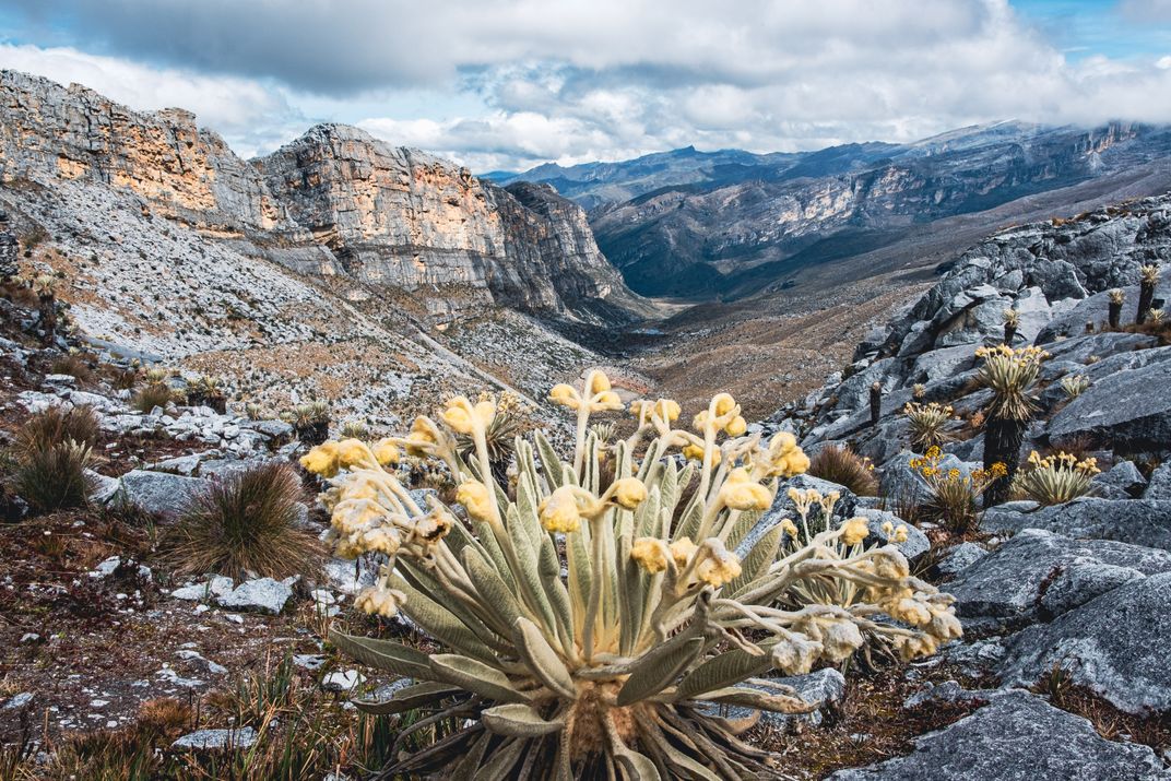 The photo depicts a view from the Pulpito del Diablo in the Cocuy National Park in Colombia. In the foreground we can see a frailejone, a plant with a crown of rosette-shaped leaves covered with whitish hairs. Because of their velvety texture, they are also known as "rabbit ears".