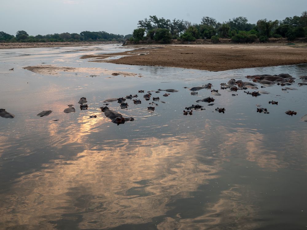 The hippos finds a haven here, where the Munyamadzi river flows into the Luangwa River. When the two rivers meat, they create some turbulent water and pools. This particular spot is busy with hippos during the warmer months, when they crowd into pools deep enough for them to stay submerged and keep cool. During the night the hippos often leave the water to graze, consuming lots of vegetation. Luangwa valley, Zambia