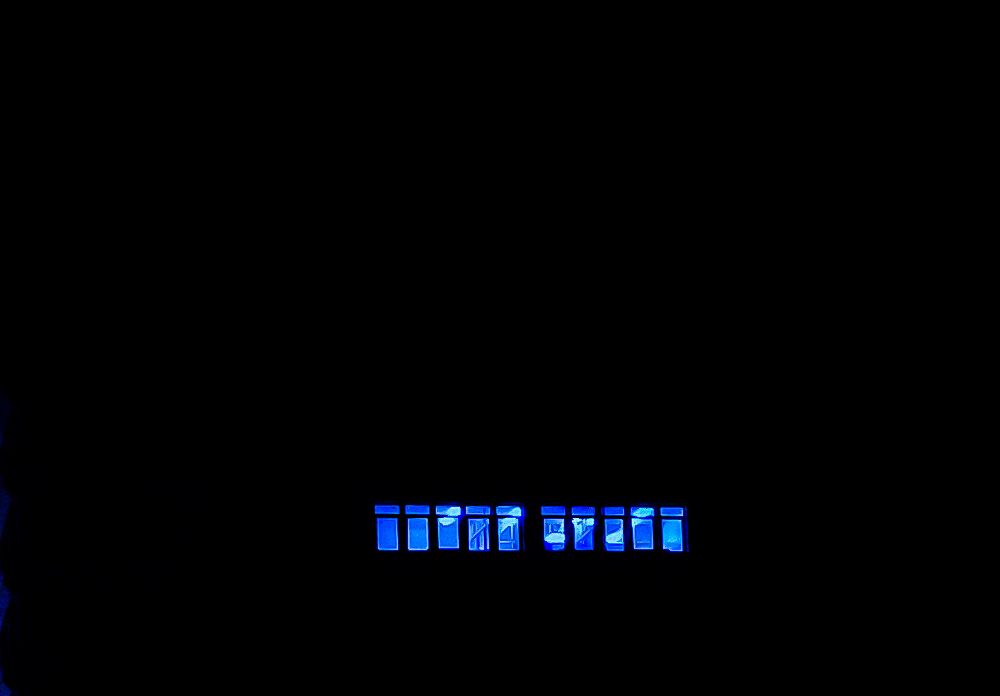 This photograph captures the stark contrast of light and shadow in an urban setting. Against a backdrop of absolute blackness, a single row of windows glows with an electric blue light. The source of the light is hidden, leaving the viewer to wonder about the story within. The composition is striking in its simplicity. The dark, undefined space dominates the frame, emphasizing the isolation and mystery of the illuminated windows. The straight line of the windows cuts through the darkness, creating a sense of order and geometry in an otherwise chaotic composition. I took this in my city. The vibrant blue is unnatural and draws the eye, hinting at something unusual or even otherworldly happening within those illuminated rooms. Overall, the photo is a study in contrasts: light and dark, order and chaos, the known and the unknown. It evokes a sense of loneliness and mystery, leaving the viewer with more questions than answers.