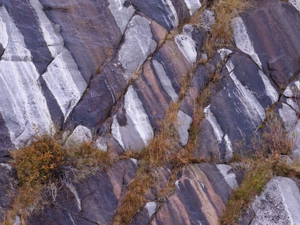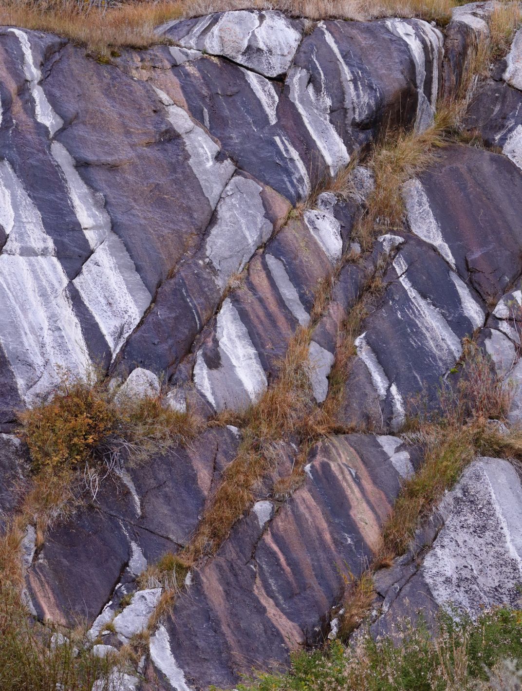 This is a depiction of a colorful rock strata full of colors, textures, and shapes. The really fascinating aspect is this was once a single rock. But thanks to the seismic activity, many layers no longer align. I love to look at this an think about the millennia of history captured here.
