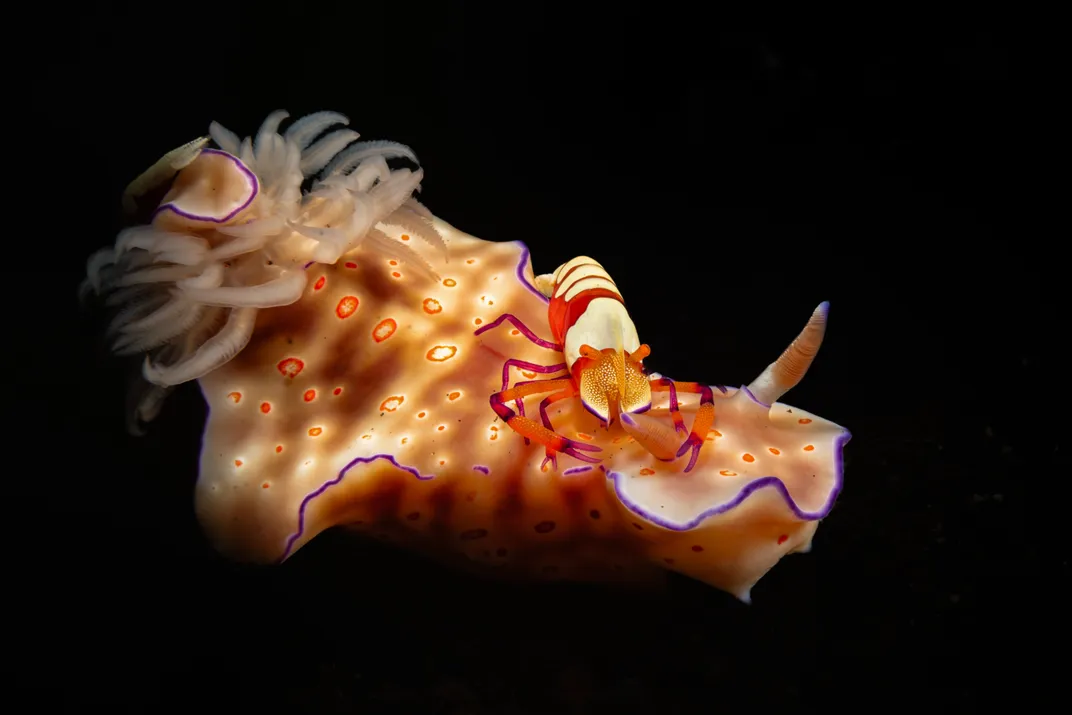 This is an underwater image of a little emperor shrimp hitching a ride on a Ceratosoma nudibranch. They have a symbiotic relationship, in which the emperor shrimp enjoys a free ride and a food source by consuming parasites and organic debris from the nudibranch's surface, while the nudibranch benefits from parasite removal.