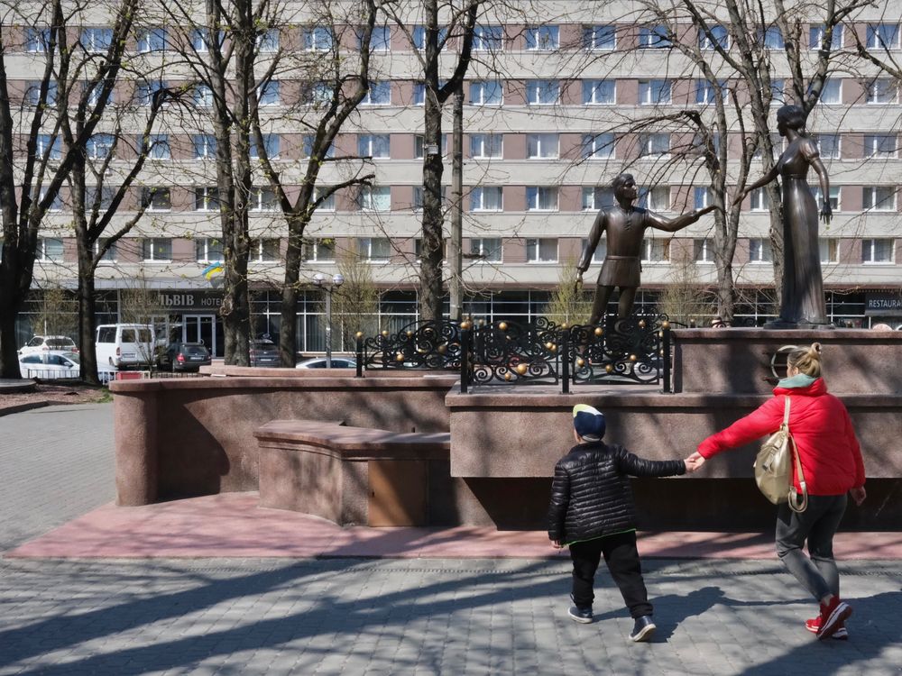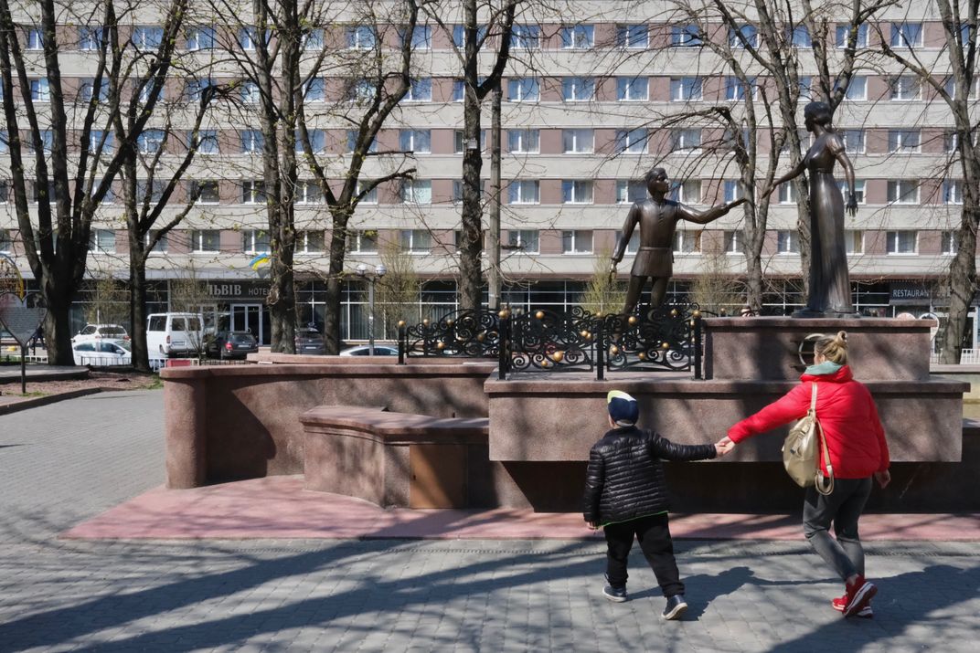 A woman and son hold hands in Lviv, reflecting the statue's gesture behind them.