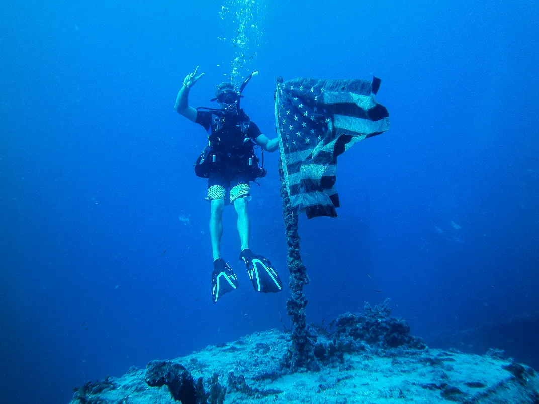 Holding the American Flag diving on the 510ft wreck of the USS Spiegel Grove