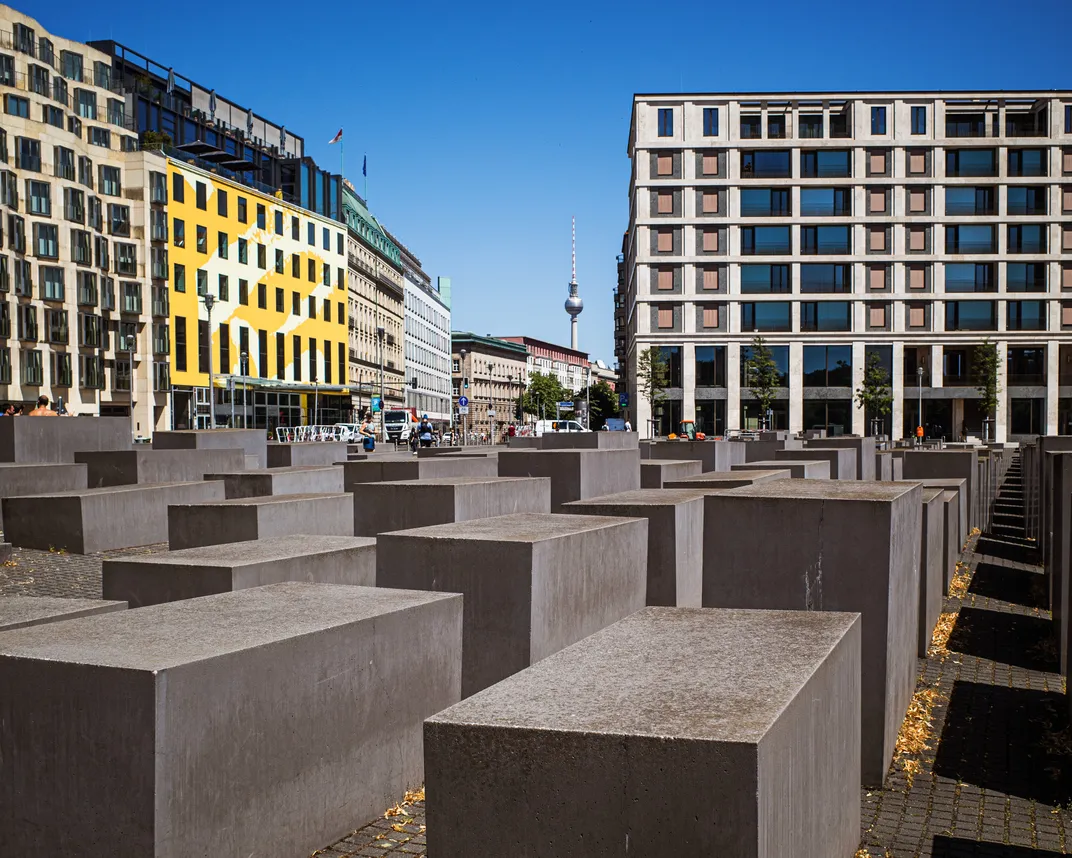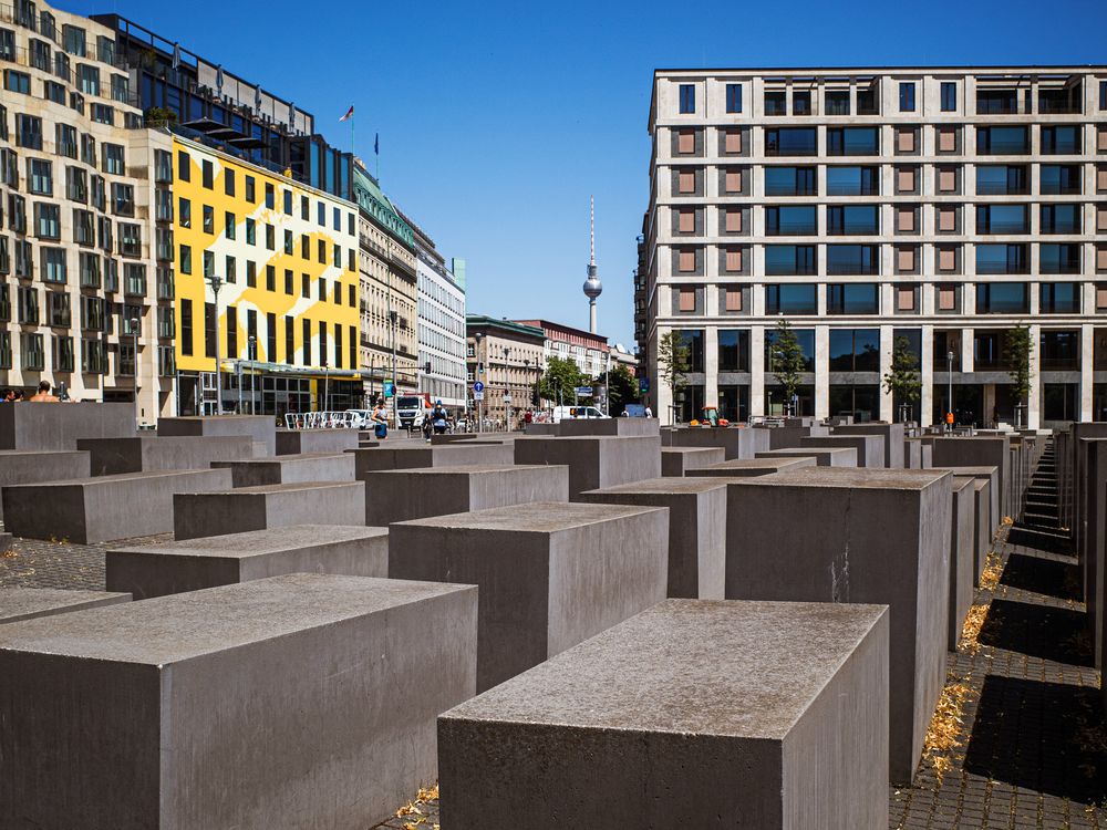 Holocaust Memorial in Berlin with the TV tower view in the background.