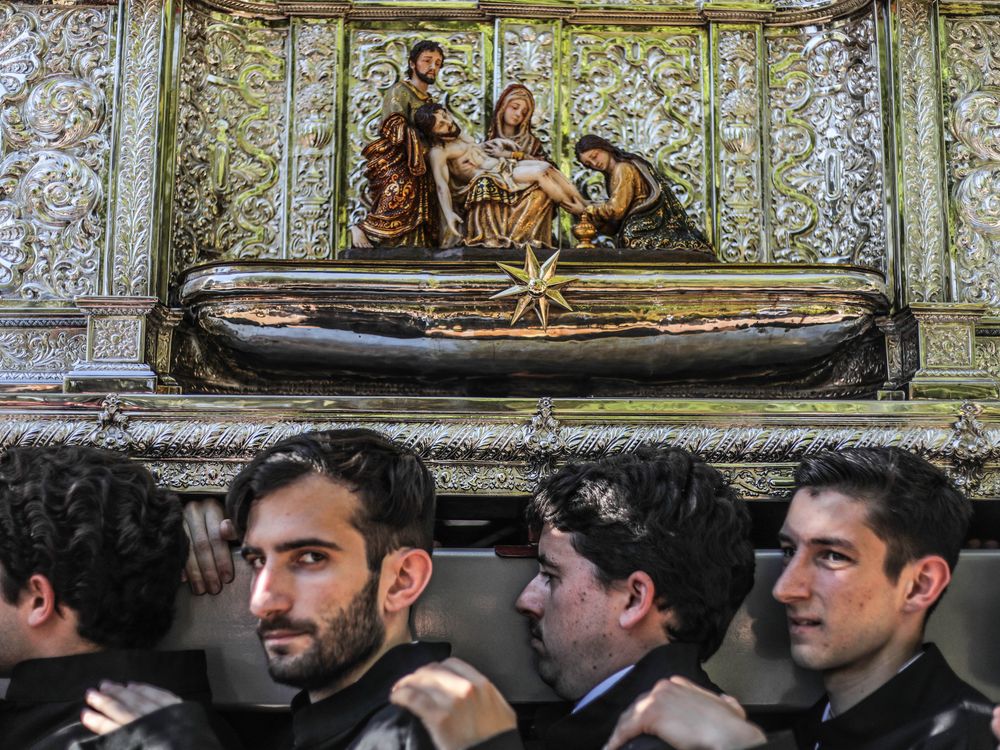 The photo was taken in Malaga during Holy Week. The men are carrying a large, heavy statue.