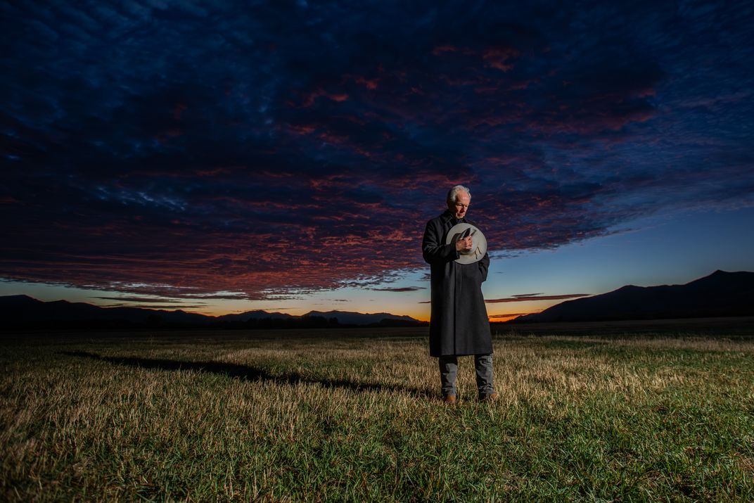 "Homage" is a dramatic dawn self-portrait, captured at Silver Creek Preserve near Sun Valley, ID. Using a radio-controlled strobe, the image illuminates the artist within a vast landscape and vibrant sunrise, serving as a profound statement of gratitude for life's blessings.