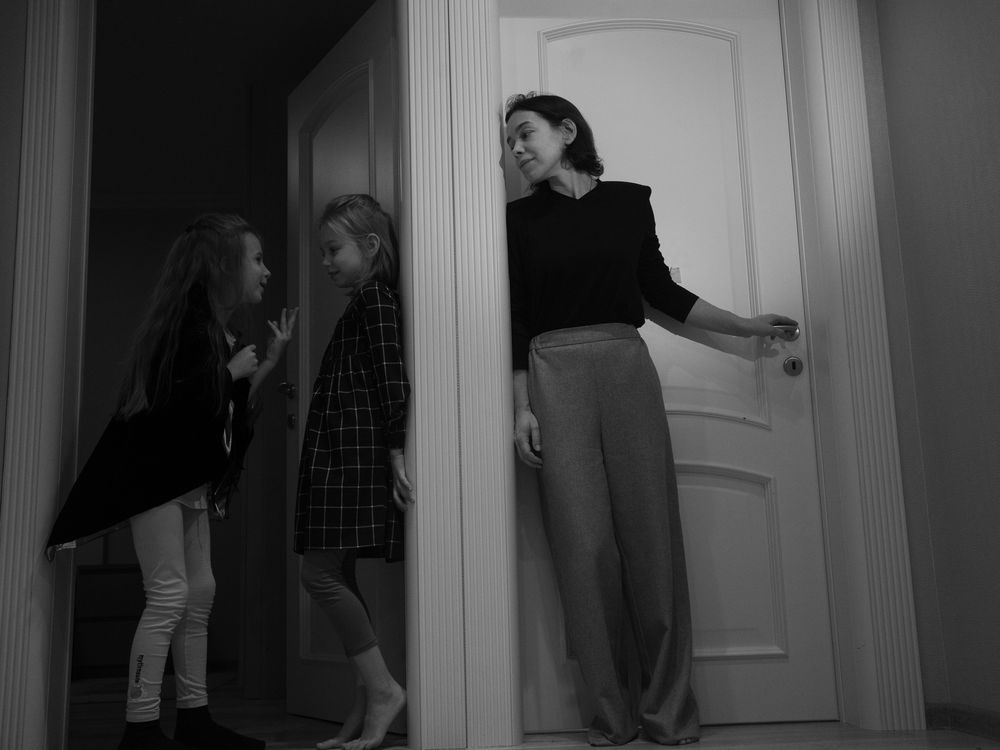 Two girls discuss their affairs, and the mother stands nearby and watches their communication.