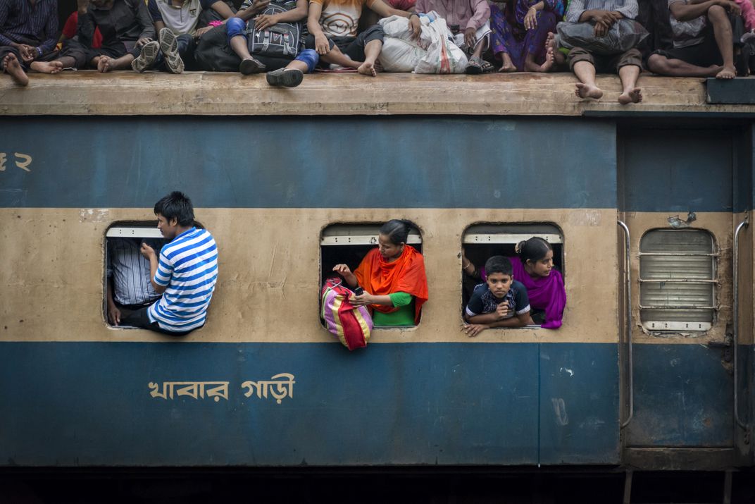 People are travelling on the roof of the train during the Holy Eid. People rush to their native home during Eid festival. Even people have to board the train through the window. Due to transportation shortage, they have to take risk of their lives to meet their relatives.