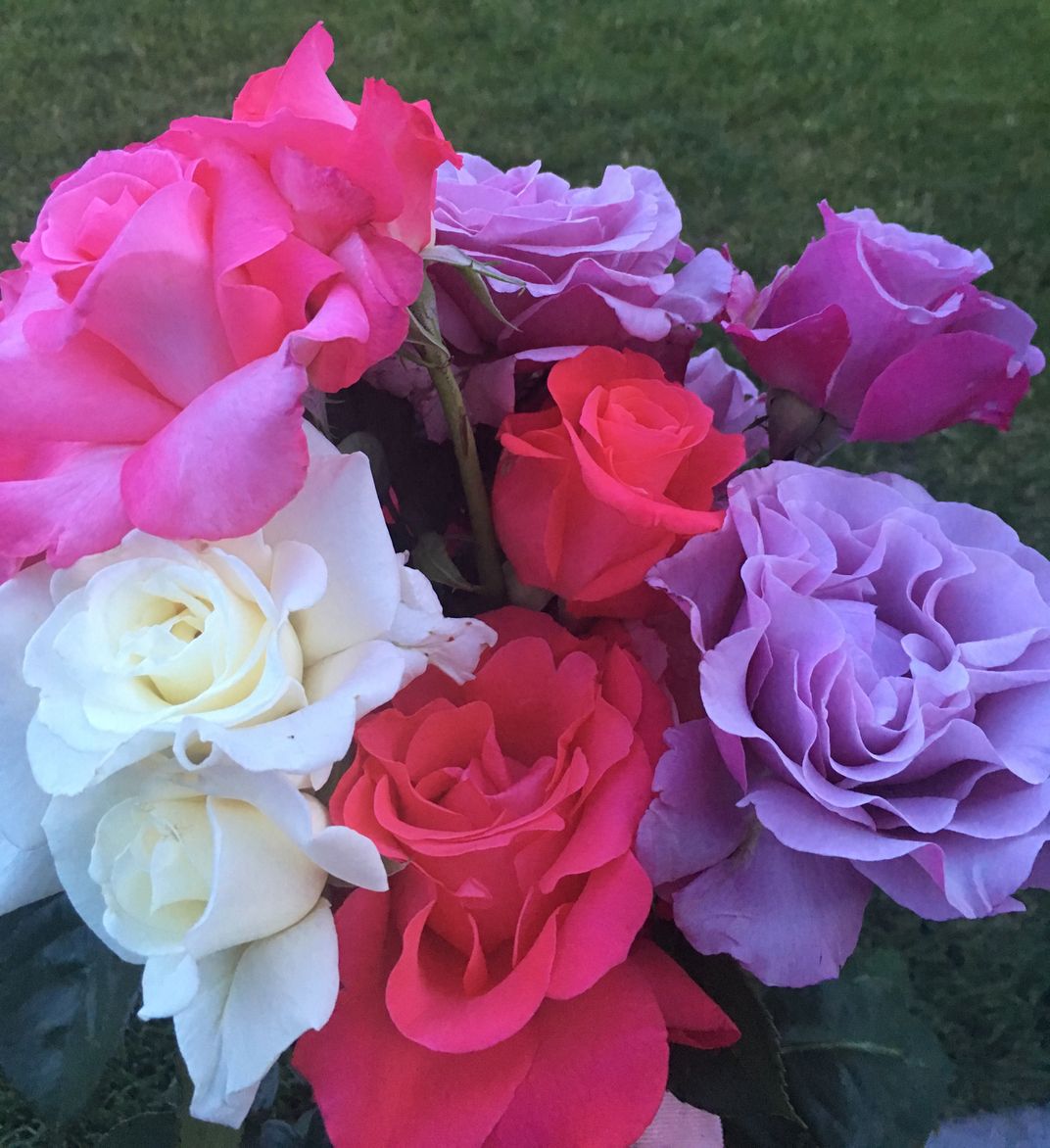 This ia bouquet of hybrid tea roses from my garden. Roses included are: Unforgettable, Touch of Class, John F. Kennedy and Neptune.