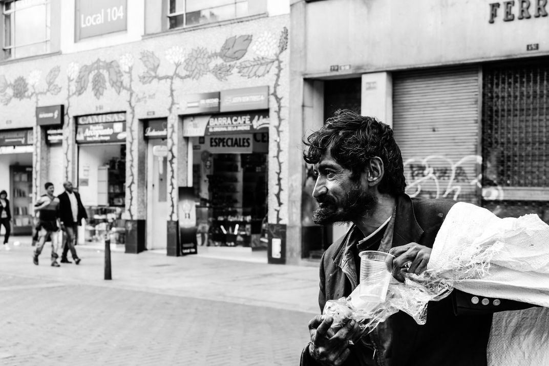 Homeless man accepting food from volunteers on the streets of Bogota, Colombia.